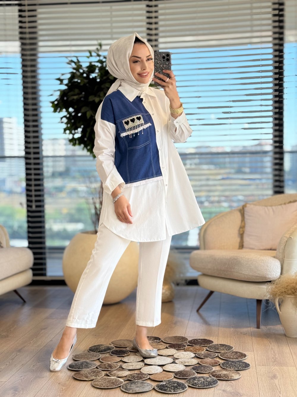 01-1204 Sol Taraf Kot Ve Zincir Detaylı Gömlek Beyaz