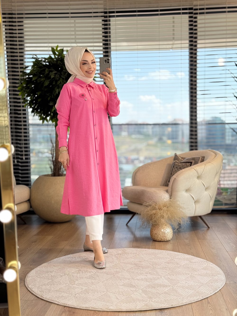 01-1294 Ön Düğmeli Uzun Tunik Pembe