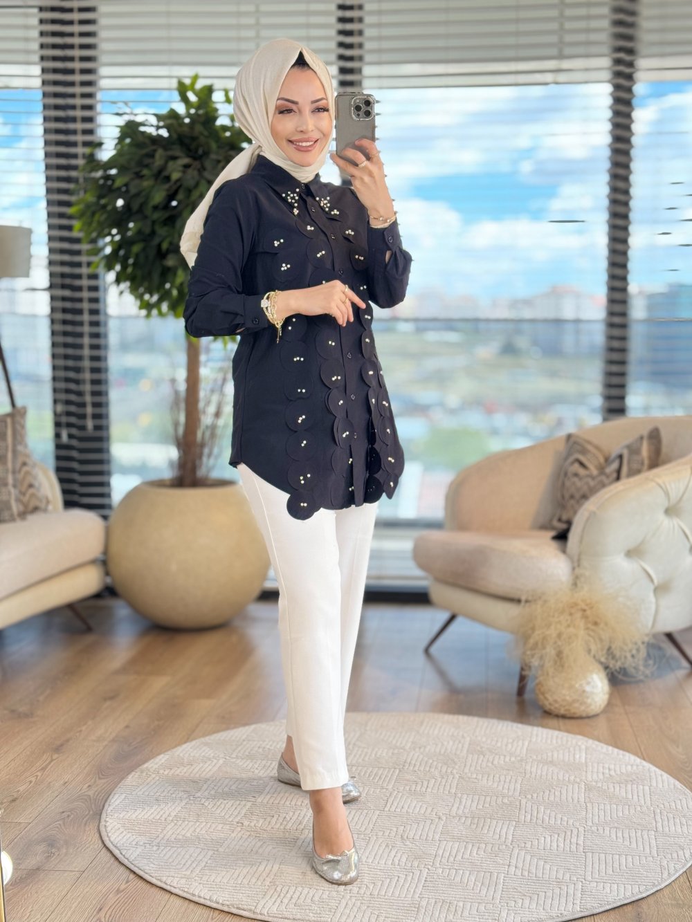 01-1318 Ön Parça Üstü İncili Gömlek Siyah