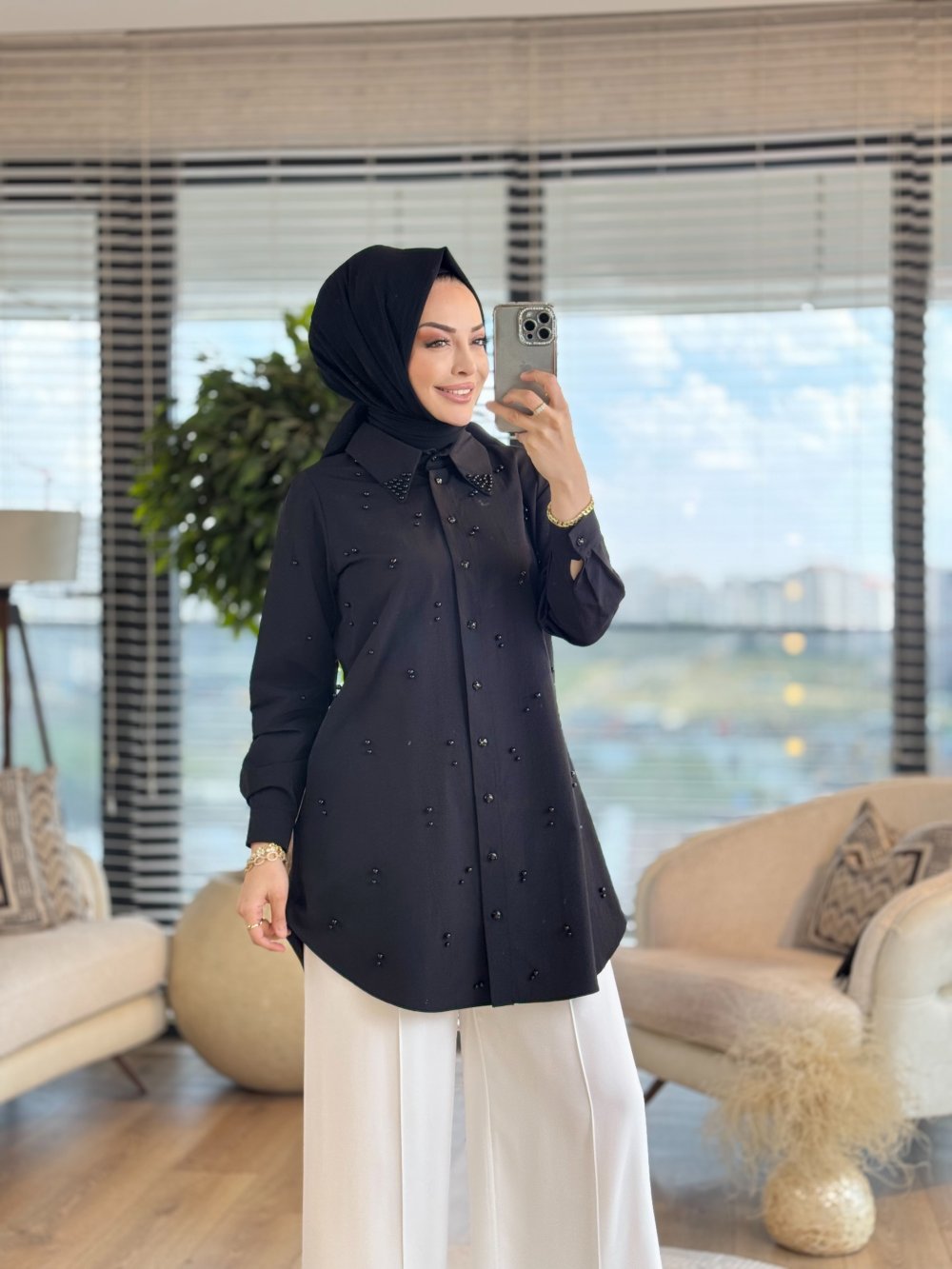 01-1323 Ön Ve Yaka Serpme İnci İşli Gömlek Siyah