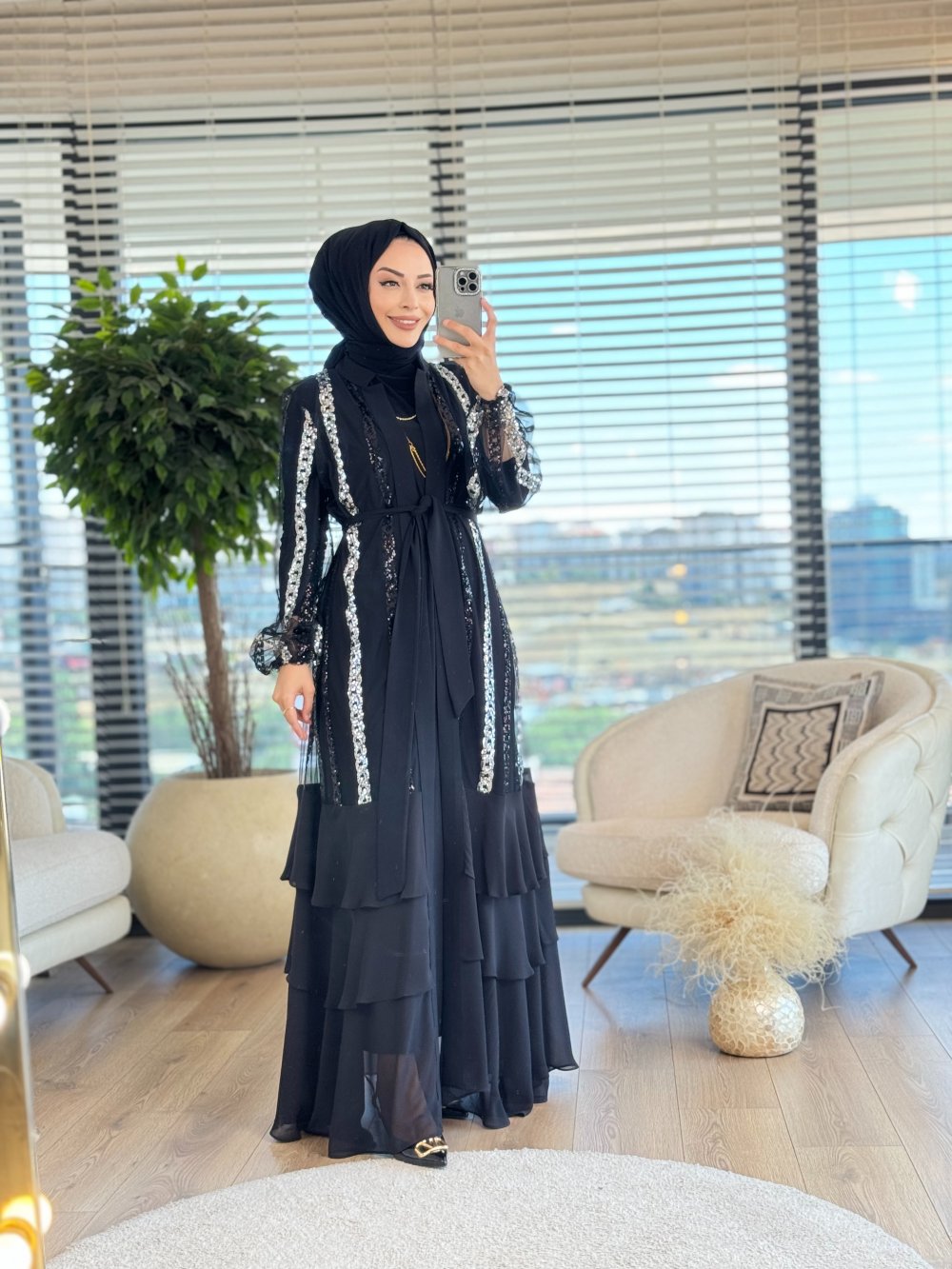 02-1473 Boyuna Pul Nakışlı 2li Takım Siyah Gümüş