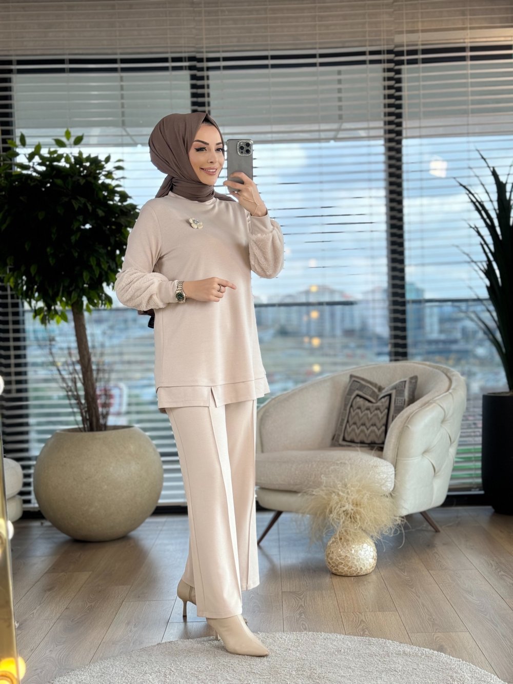 02-2178 Kolları Kürk Parçalı Takım Bej