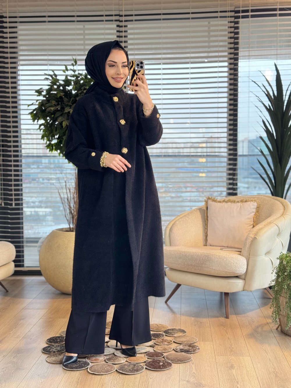 080 Angora Patı Ve Manşeti Düğmeli Kap Siyah