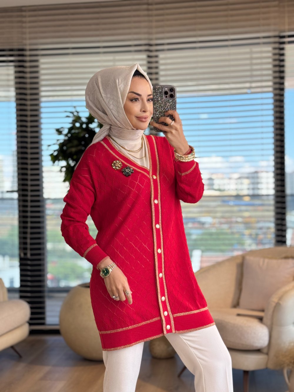 101005 Baklava Desenli Merserize Hırka Kırmızı