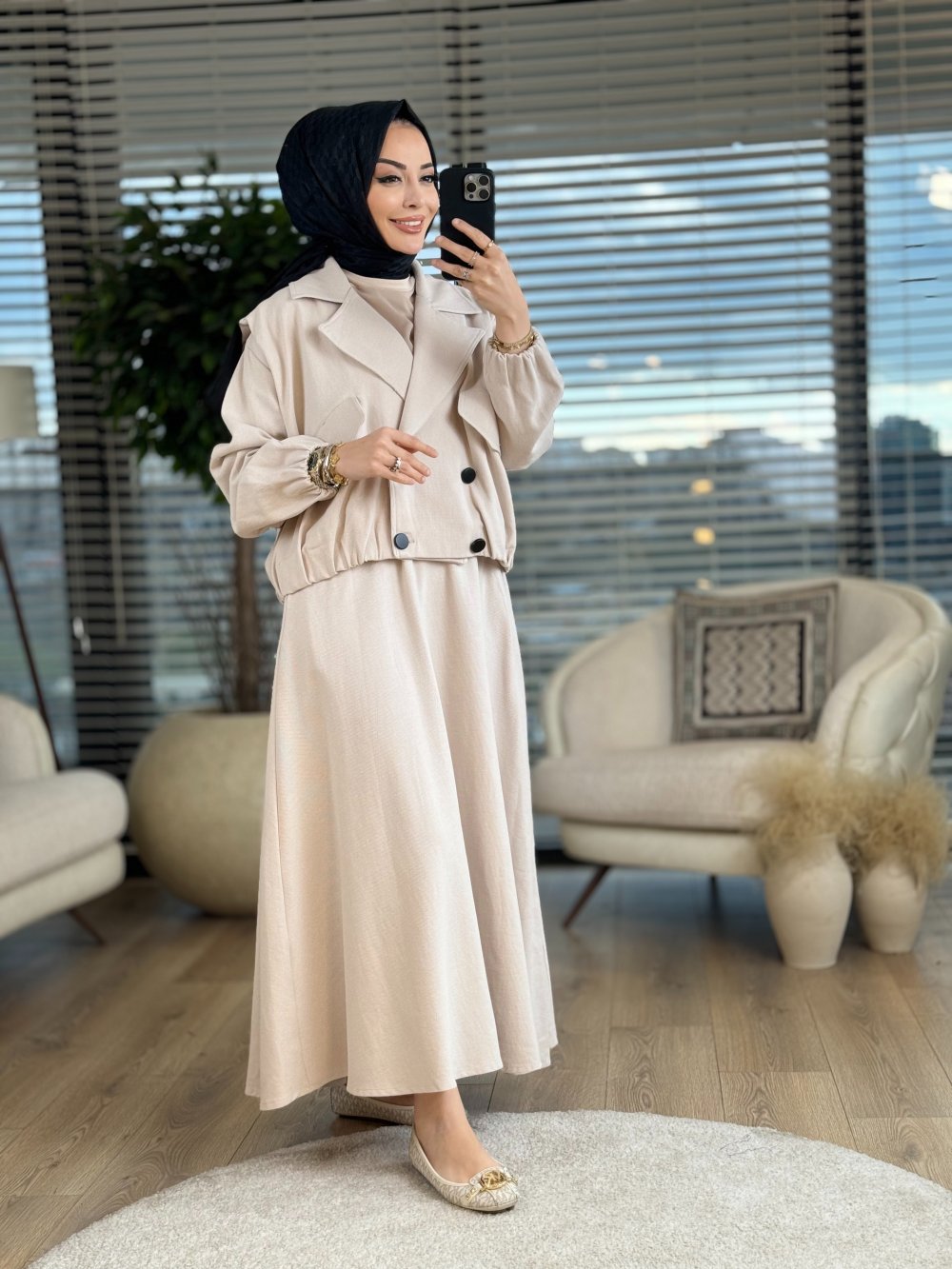 10432 Ön Dört Düğme Ceket Etekli Takım Bej