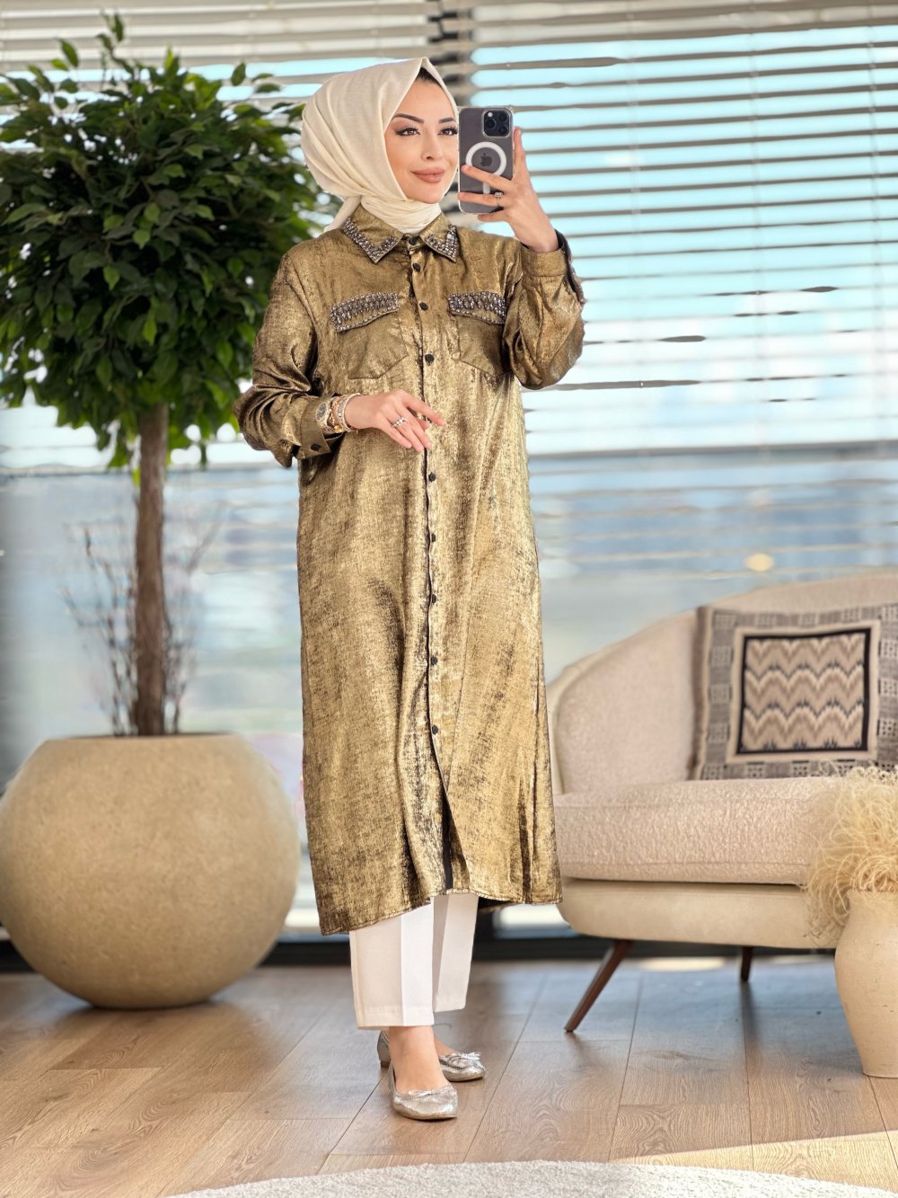 1058 Yaldızlı Taş Detaylı Tunik Gold