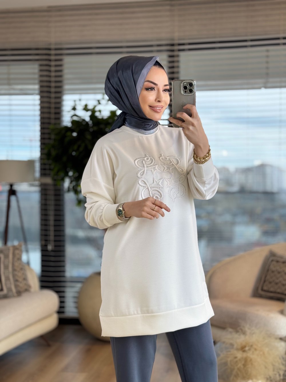 10612 Ön Kabartma Motif İşli Tunik Ekru