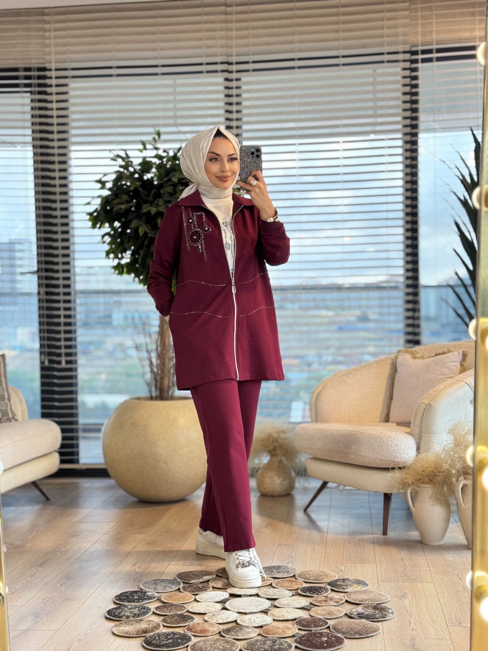 10727 Taş Arma Baskılı Üçlü Takım Bordo
