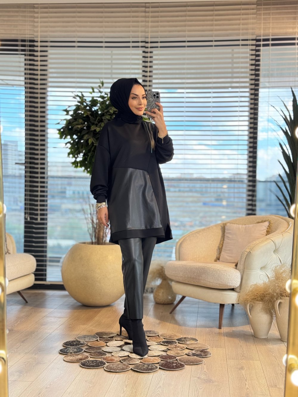 10728 Deri Ve Fermuar Detaylı Tunik Siyah