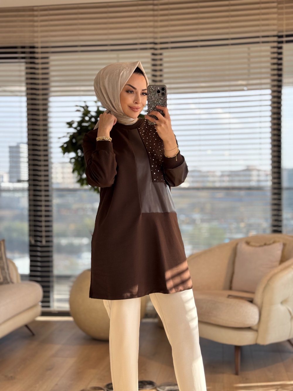 10738 Sağ Taraf Taş Baskılı Ve Derili Tunik Kahve