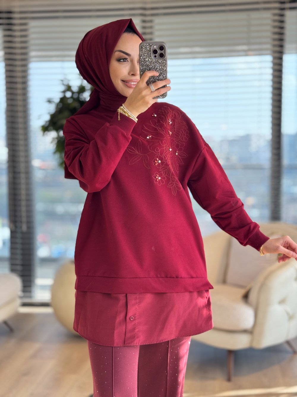 10739 Sağ Omuz Nakış Ve Taş İşlemeli Tunik Bordo