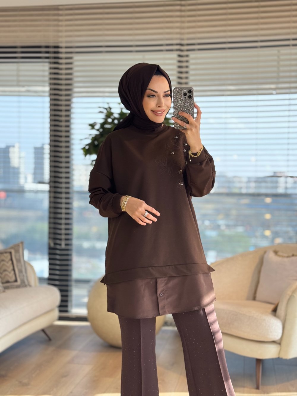 10739 Sağ Omuz Nakış Ve Taş İşlemeli Tunik Kahve