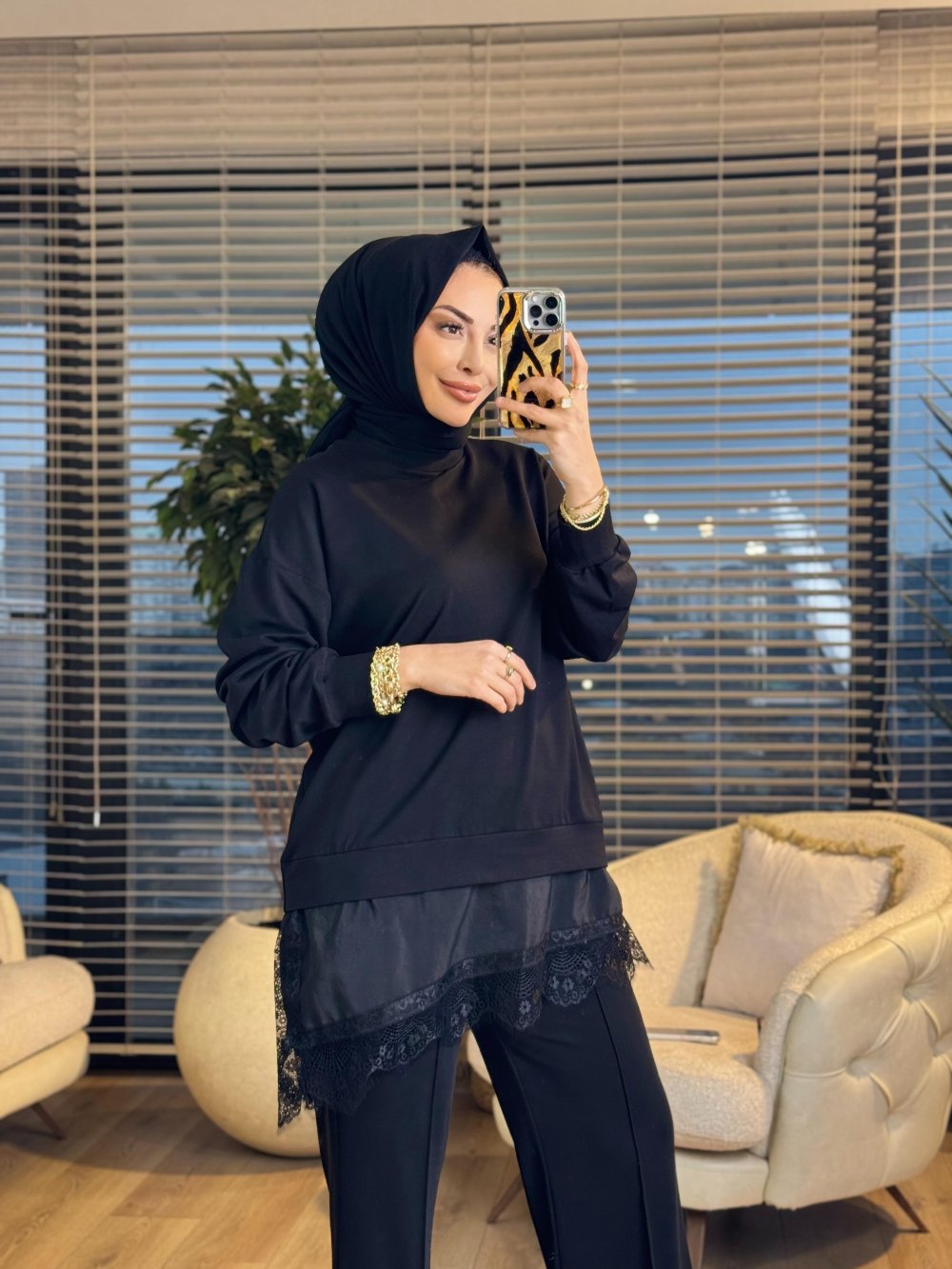 10766 Etek Ucu Dantelli Tunik Siyah