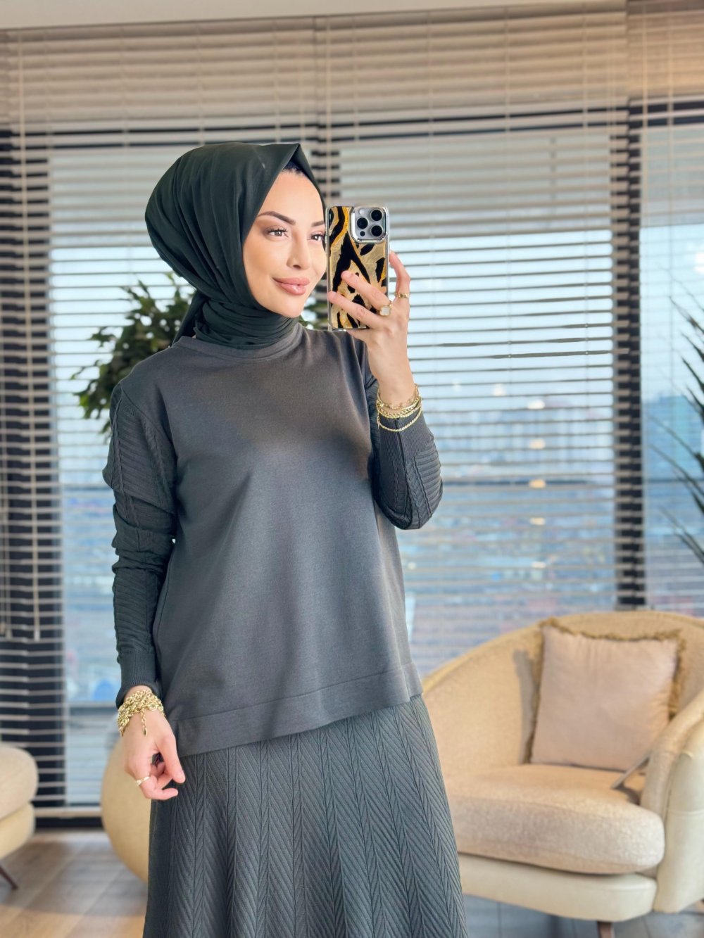 114 Etek Ve Kolu Balık Sırtı Desenli Takım Haki