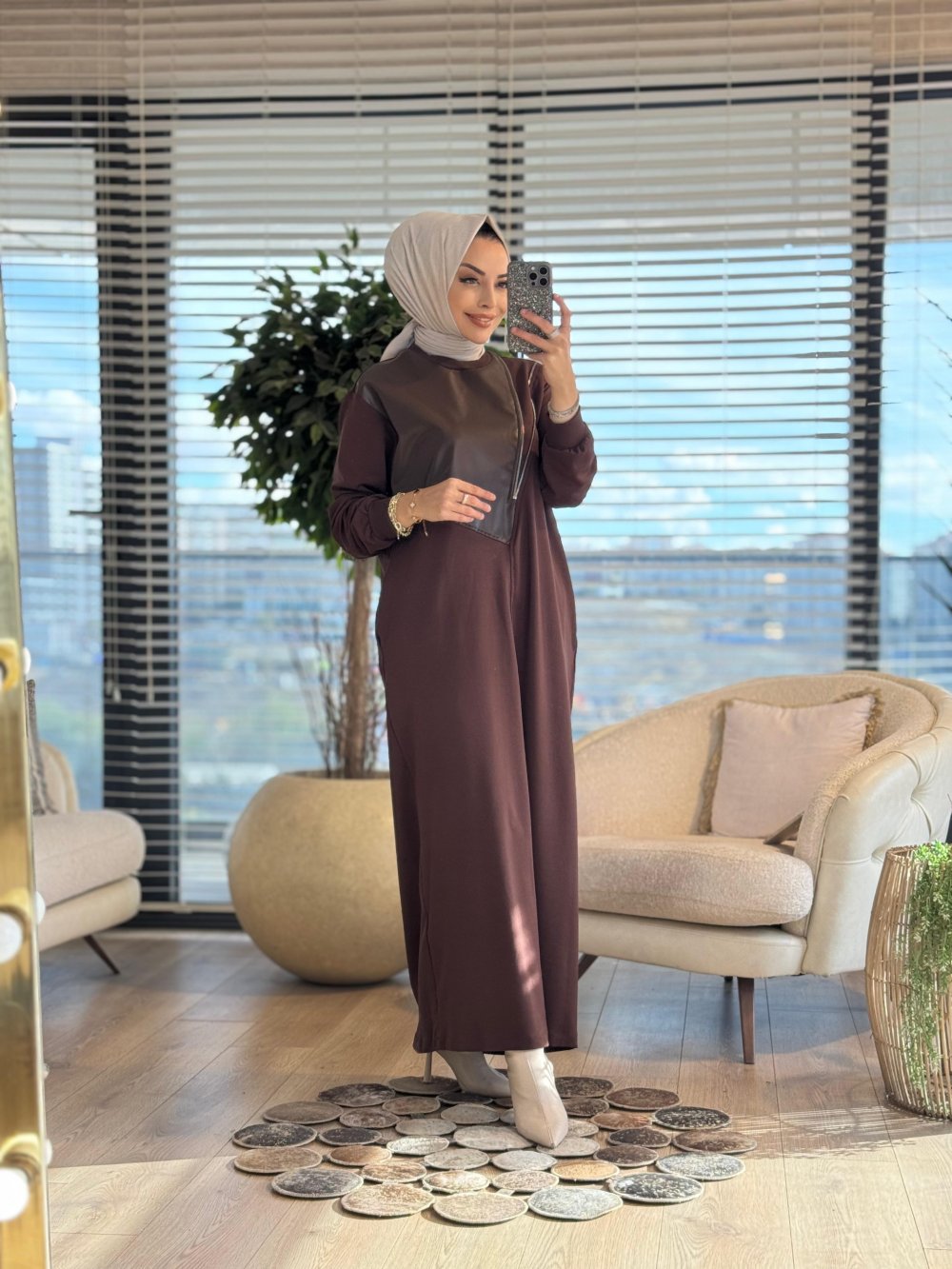 12656 Deri Parçalı Fermuar Detaylı Elbise Kahve