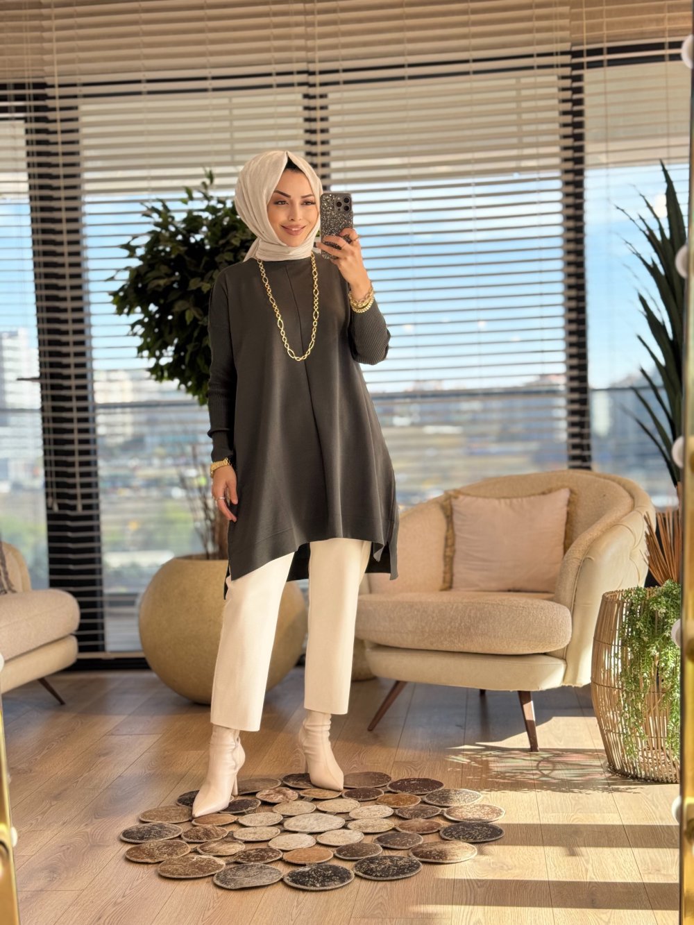 127 Kolları Lastik Örgü Triko Tunik Haki