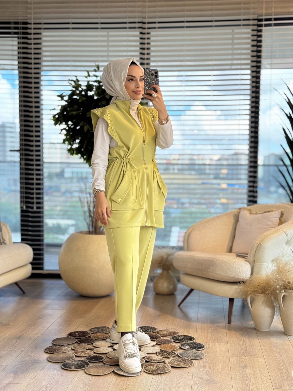 1392 Omuzları Zımbalı Yelekli Takım Yeşil