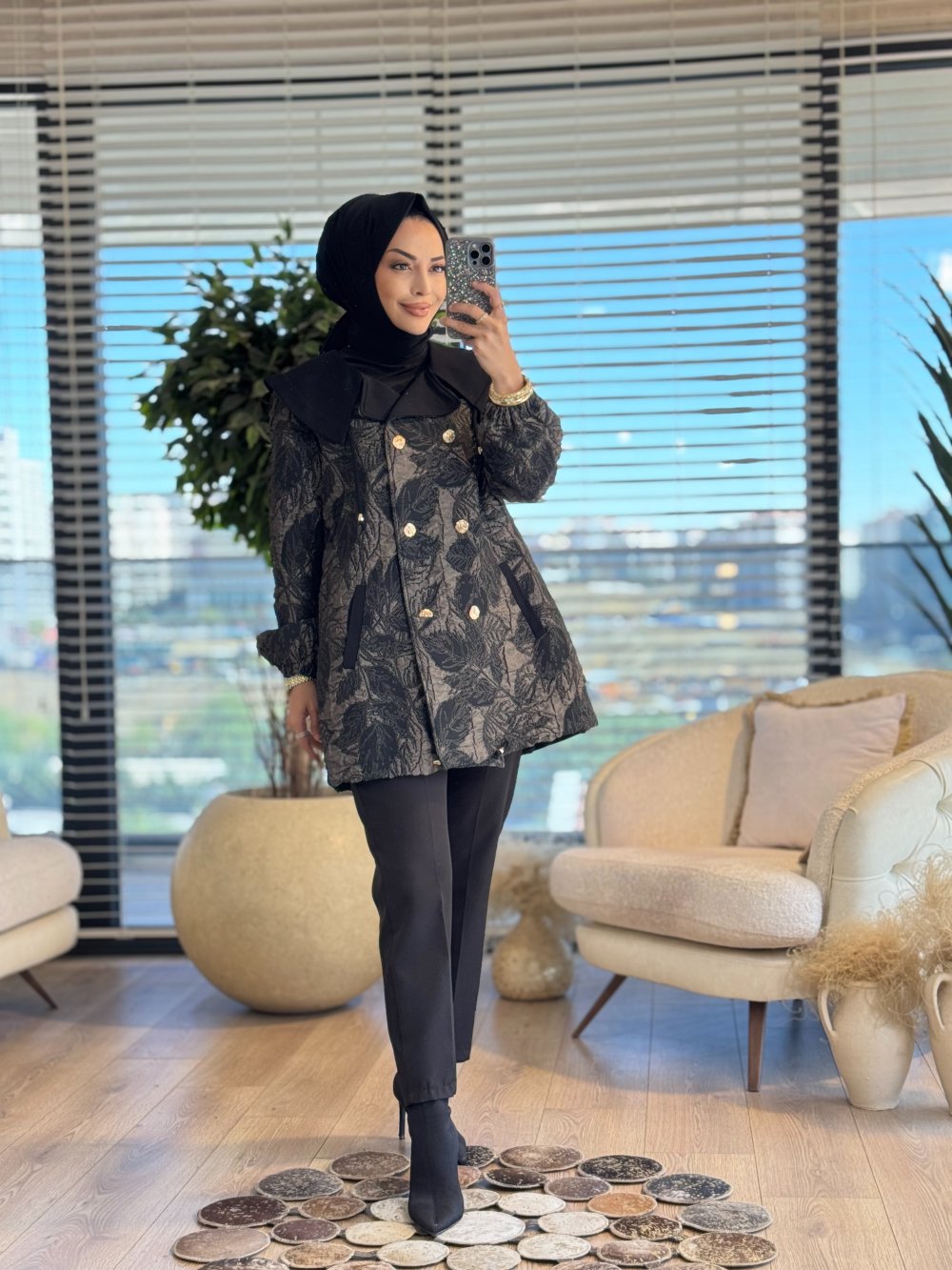14-1159 Kabartma Desenli Altı Düğmeli Ceket Vizon