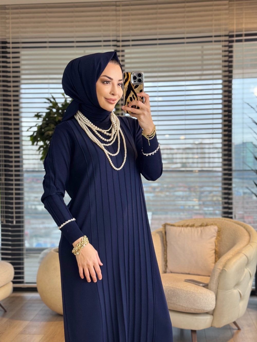 140 Etek Kol Ucu Sutaşlı Triko Elbise Lacivert