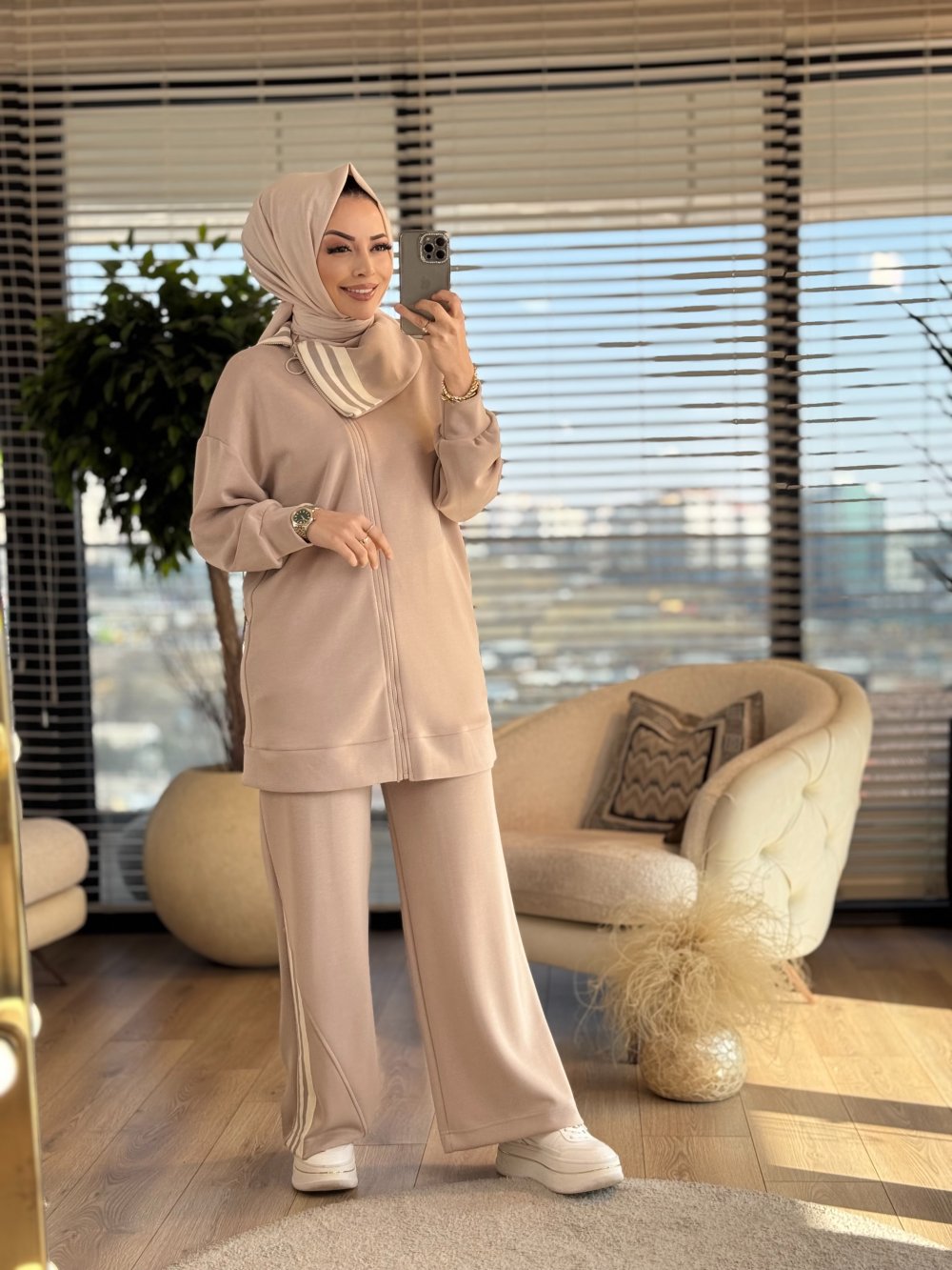 14292 Yaka Ve Paça Çizgi Ribanalı Takım Bej