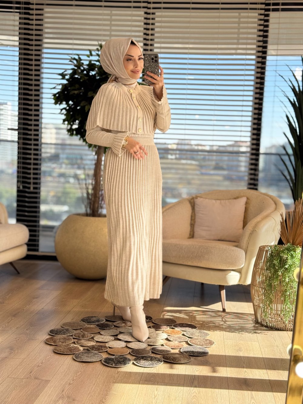 14502 Gold Düğmeli Triko Elbise 2li Takım Bej