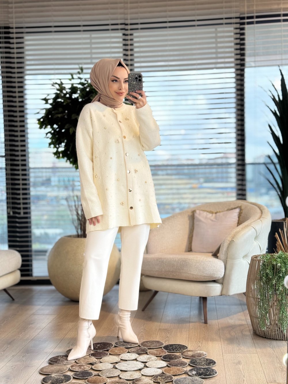 145120 Angora İnci Taş İşlemeli Hırka Ekru