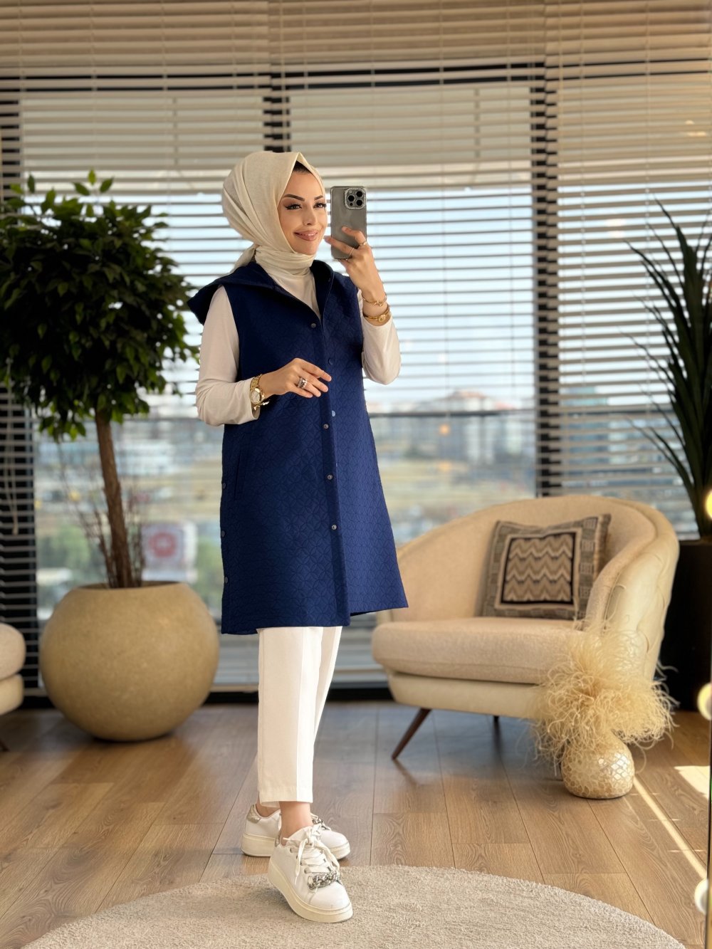 16-1098 Çiçek Kapitone Desen Çıtçıtlı Yelek Lacivert