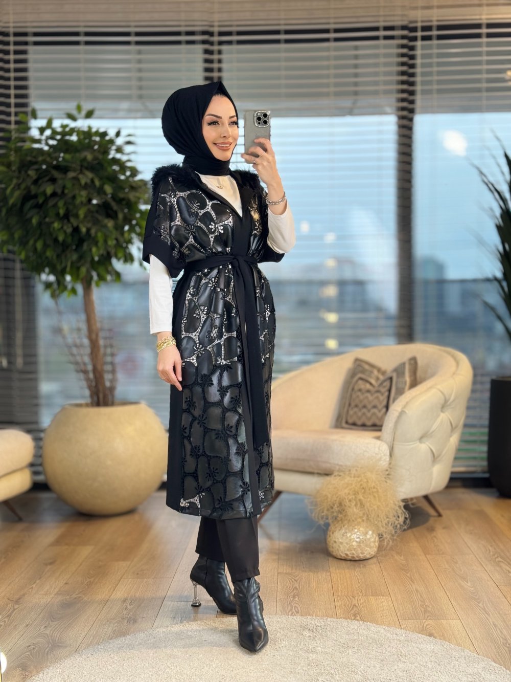 16-1106 Ön Deri Ve Dantel Detaylı Yelek Siyah