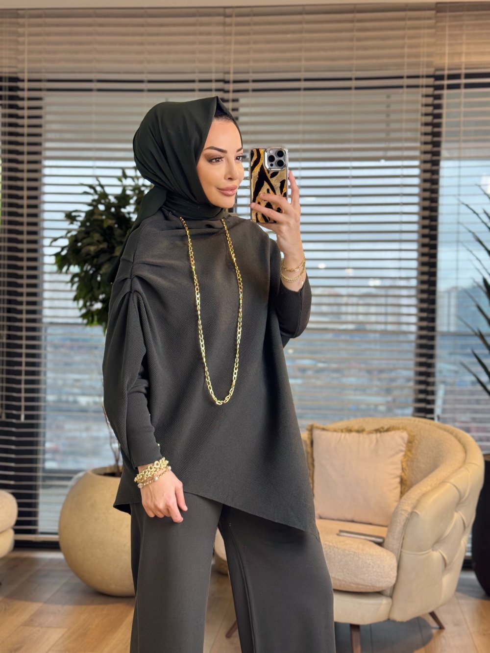 161 Asimetrik Omzu Drapeli Triko Tunik Haki