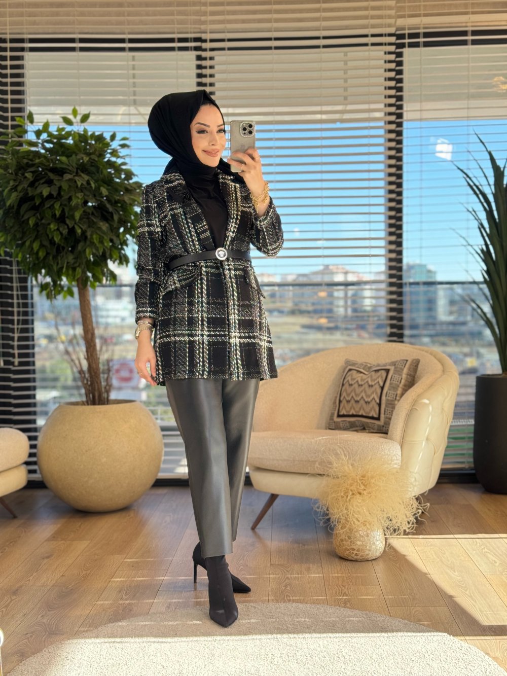16704 Kareli Yaka Boncuk Kuş İşli Ceket Siyah