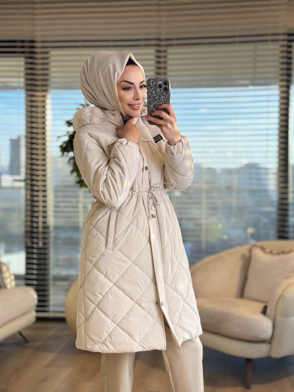2024 Kapitone Kapş.Kürk Uzun Kaban Bej