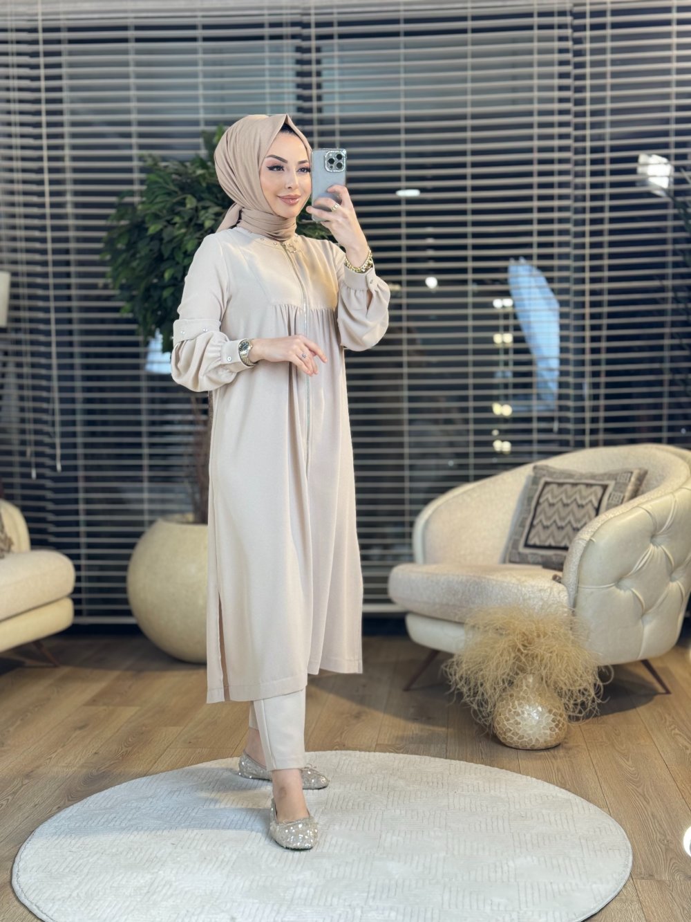 2051 Yaka Ve Kol Zımba Detaylı Kap Bej