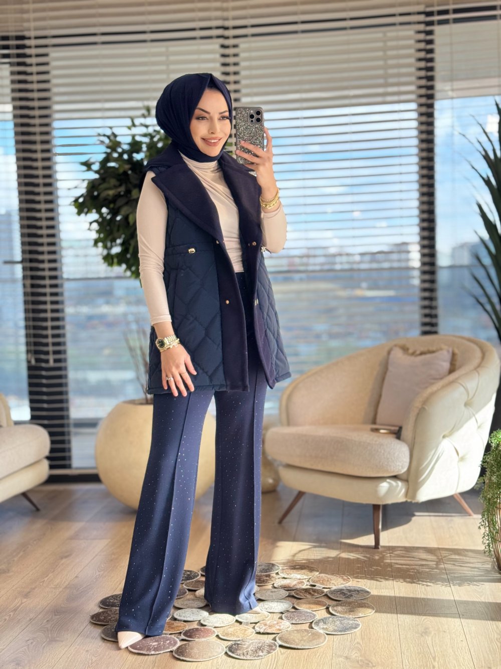 2190 Kapitone Kaşe Detaylı Yelek Lacivert