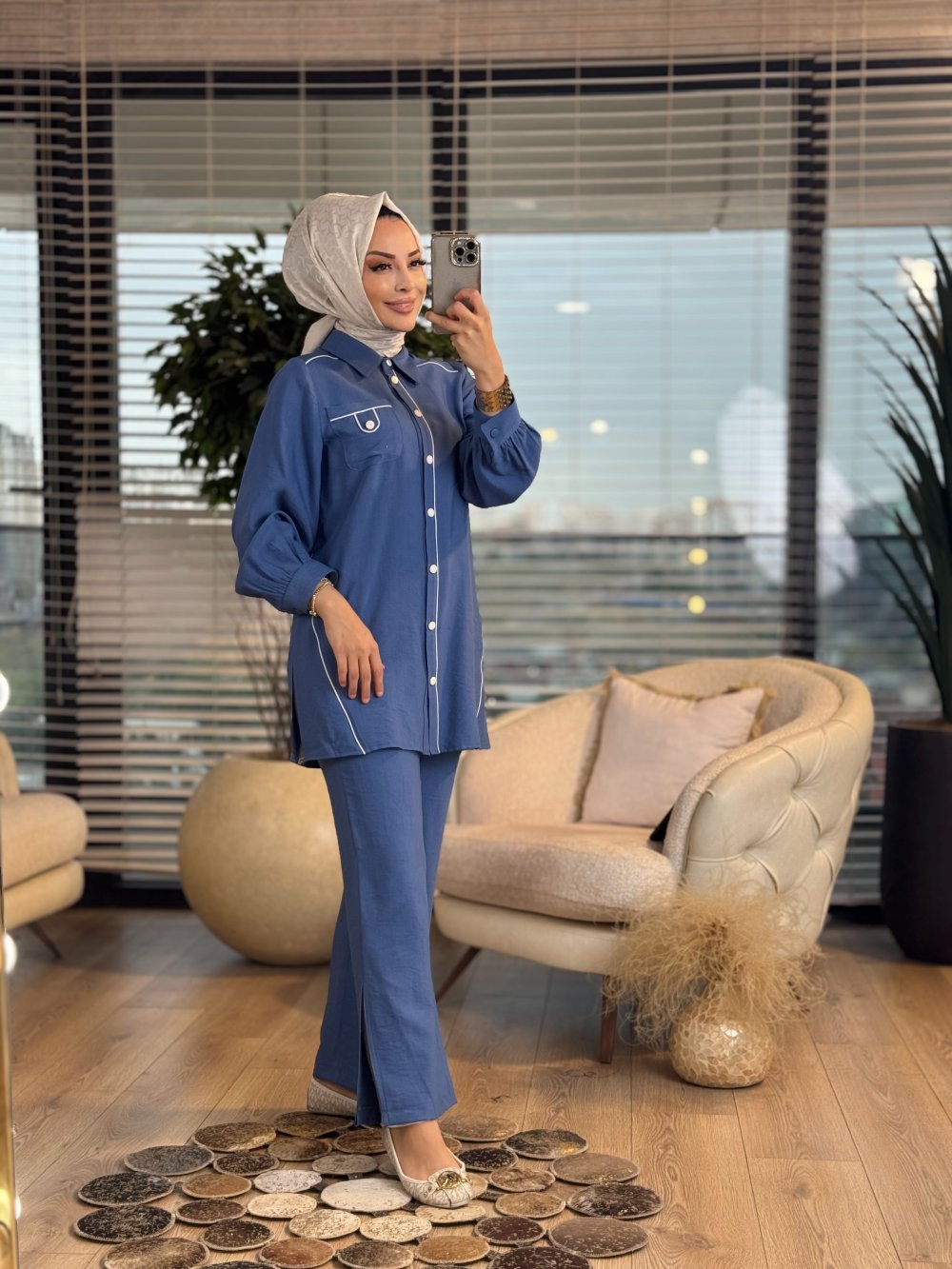2246 Biye Detaylı Paça Yırtmaçlı Takım İnidgo
