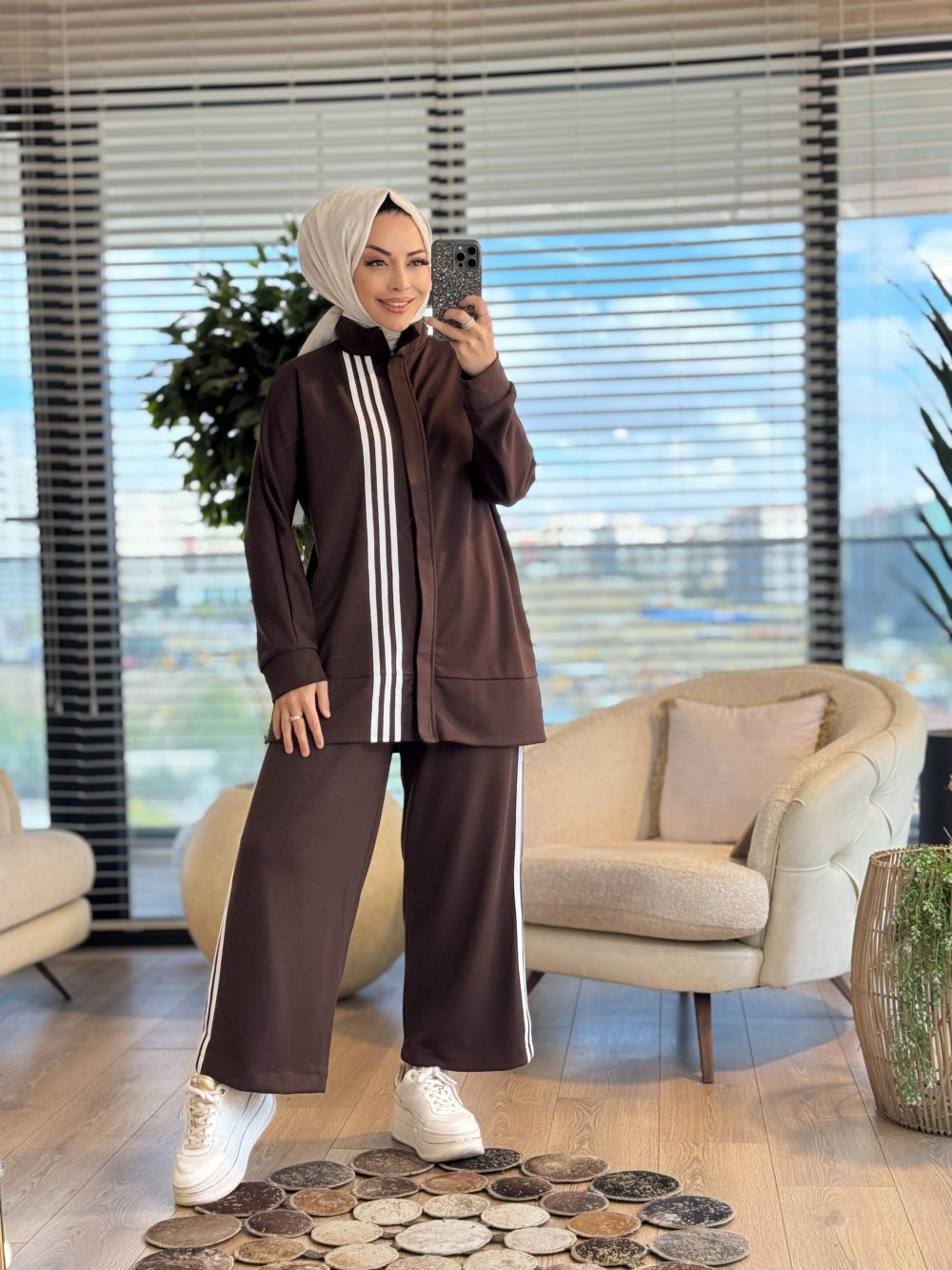 22754 Ön Ve Pantolon Yanı Çizgili Takım Kahve