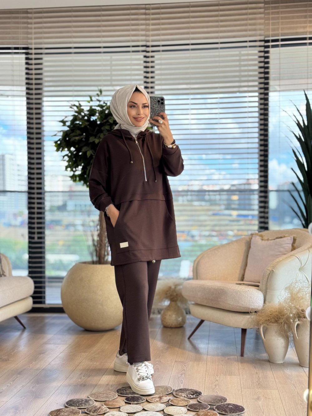 22775 Ön Parça Detaylı Ferm.Kapşonlu Takım Kahve