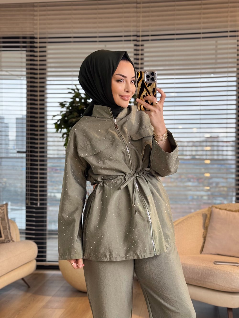 22827 Üstü Serpme Taş Baskılı Fermuarlı Takım Çağla