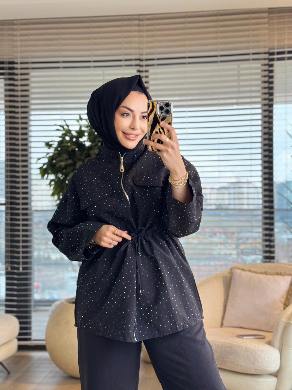 22827 Üstü Serpme Taş Baskılı Fermuarlı Takım Siyah