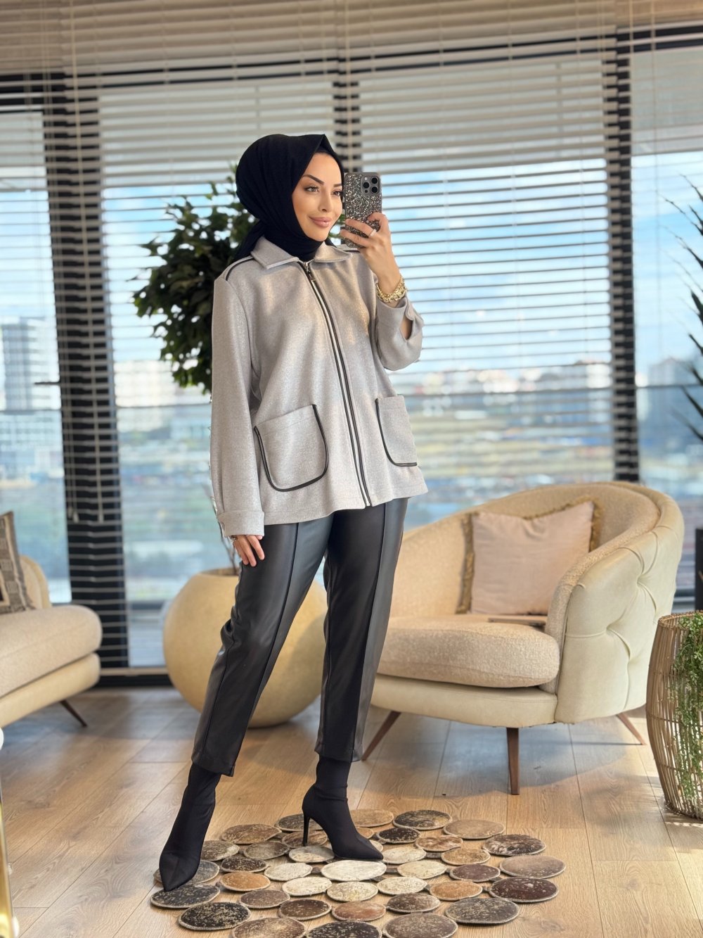 2342 Üst Triko Hırka Fermuarlı Deri Pantolon Takım Gri