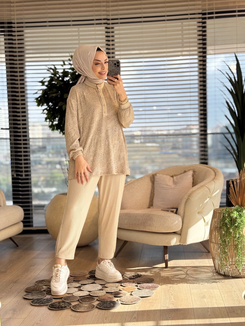 2356 Üst Varak Baskılı Triko Pantolon Takım Bej