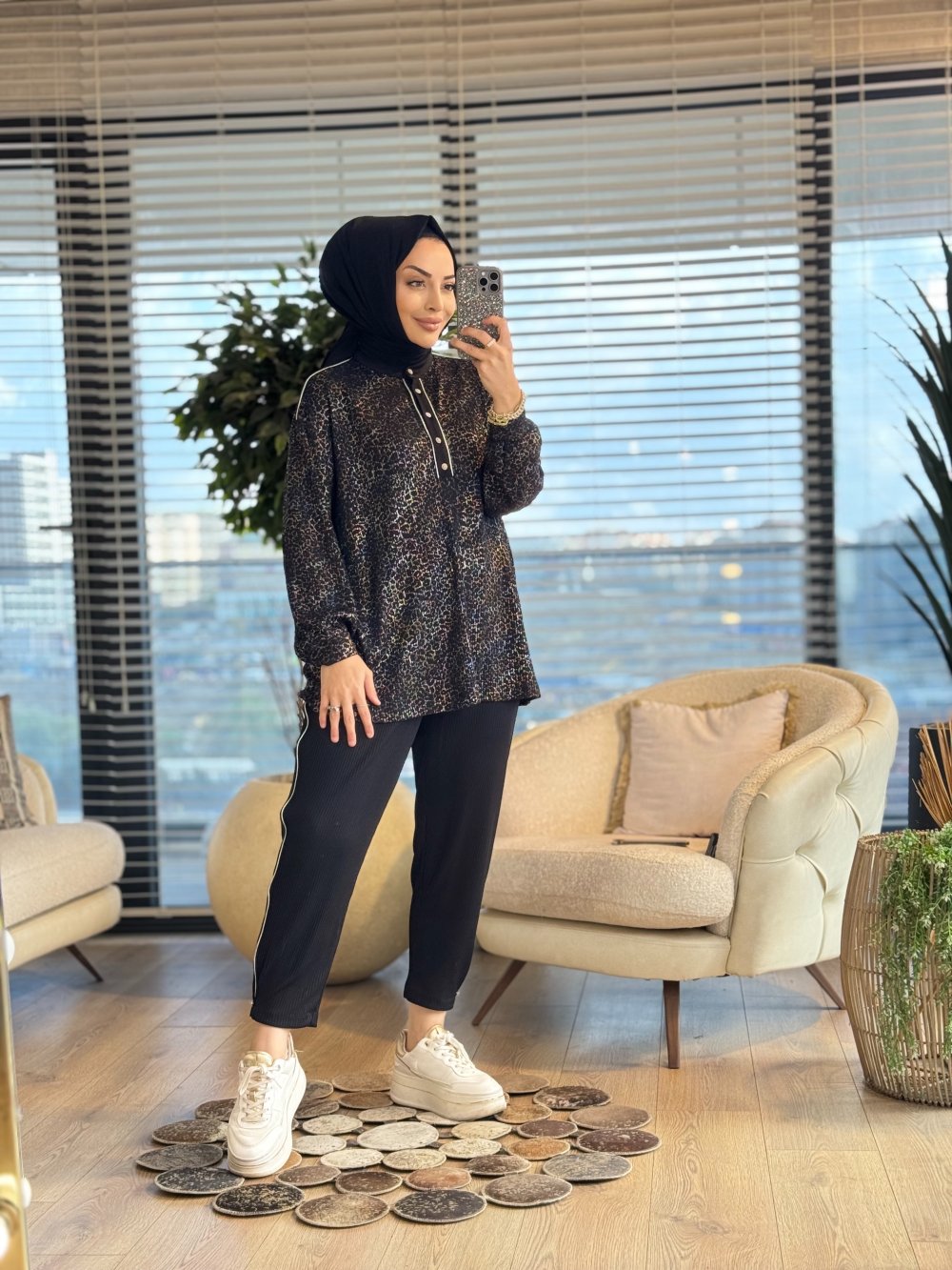 2356 Üst Varak Baskılı Triko Pantolon Takım Siyah