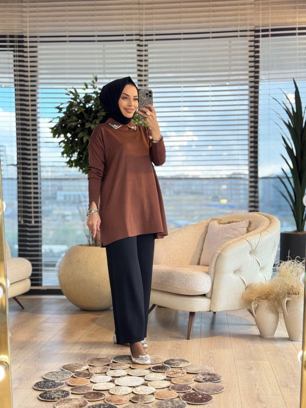 239 Yakası Pırlanta Taşlı Triko Tunik Kahve