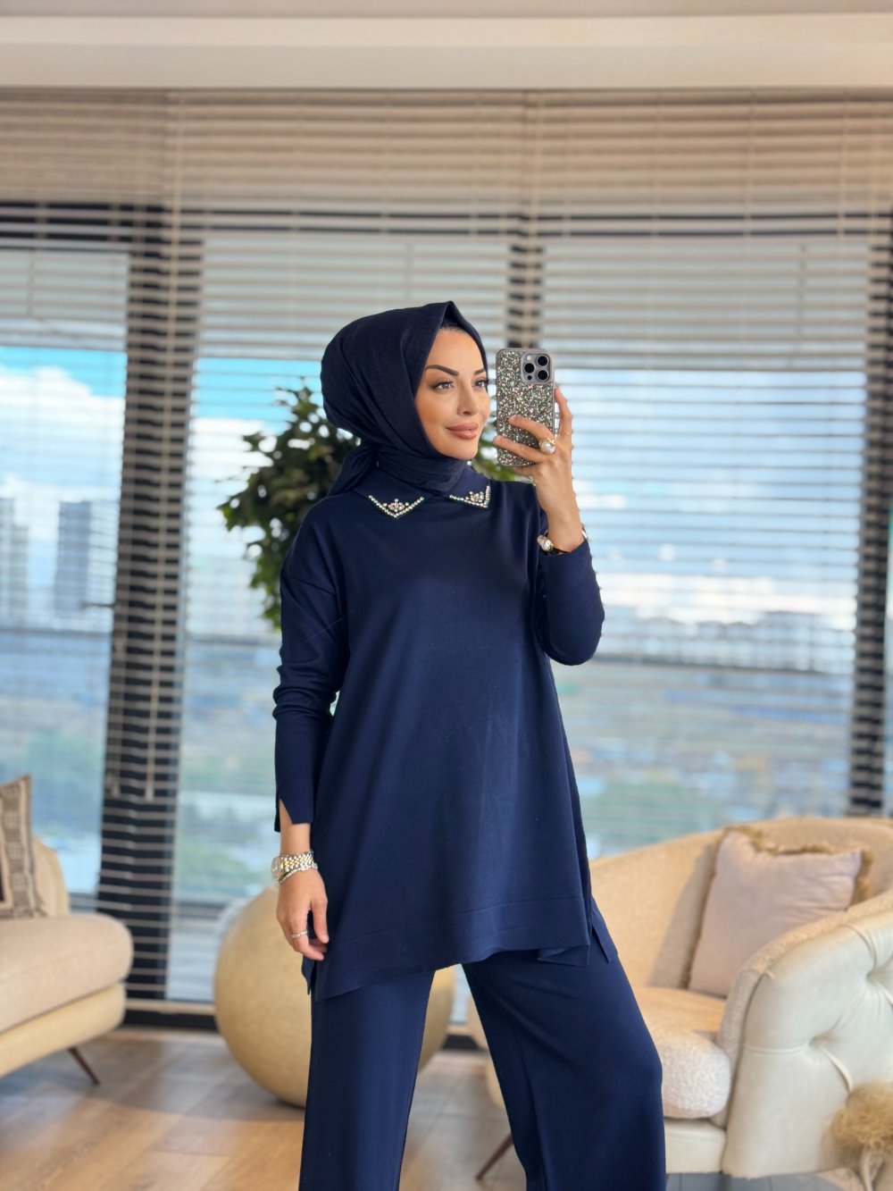 239 Yakası Pırlanta Taşlı Triko Tunik Lacivert