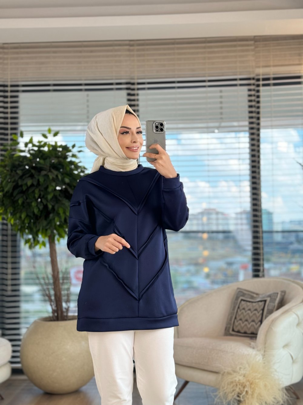 24034 Ön V Dikiş Parçalı Scuba Tunik Lacivert