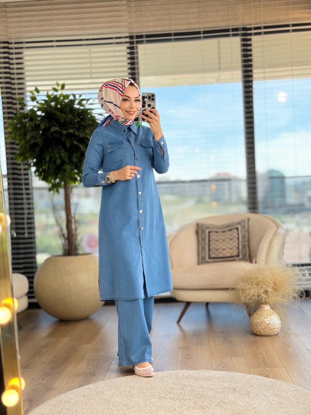2405 Kot Cep Kapağı Zımba Detaylı Tunik Mavi