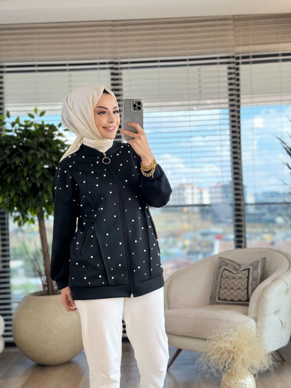 24335 Scuba Ön İnci İşli Fermuarlı Hırka Siyah