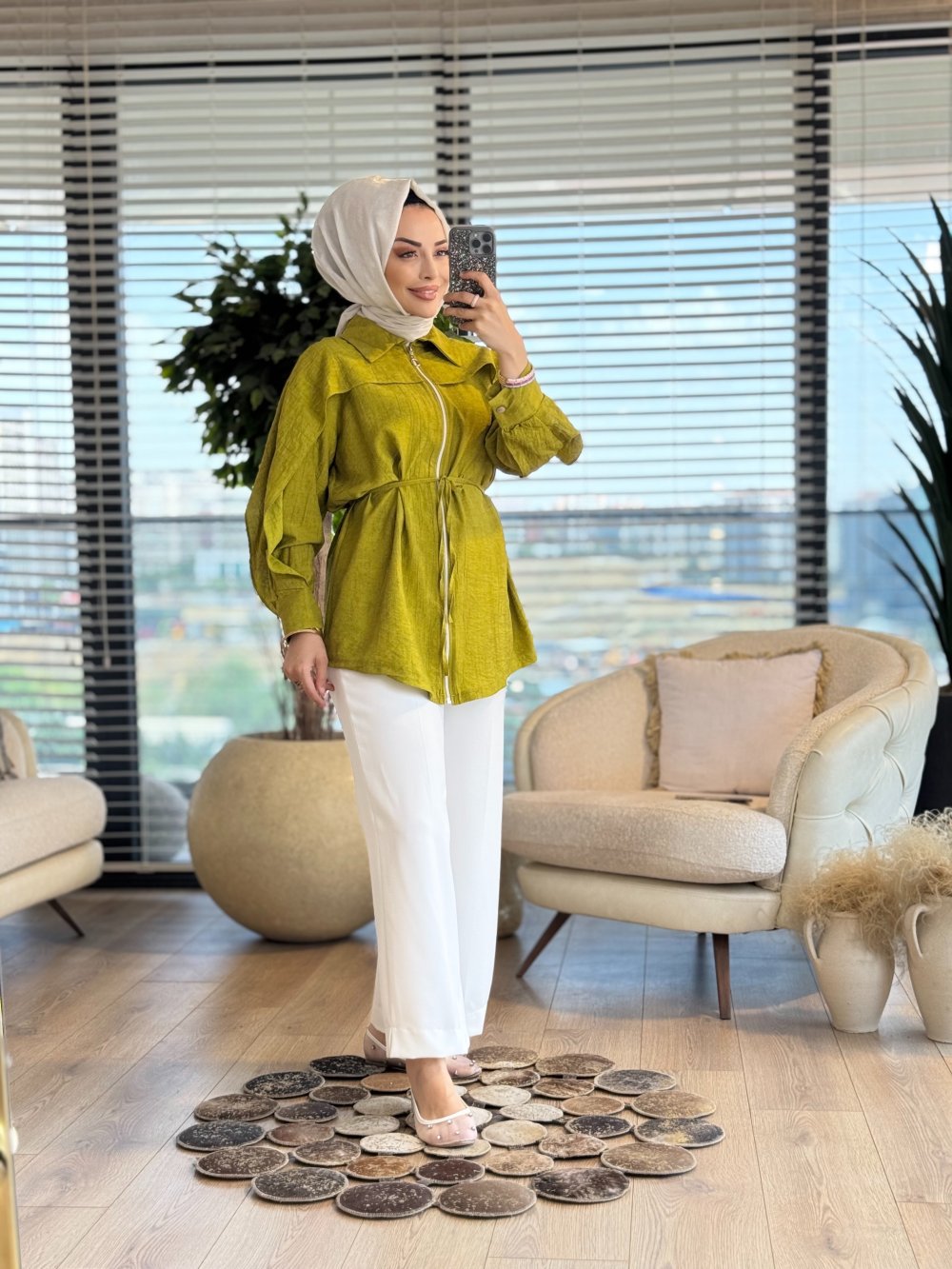 24331 Batik Omuz Parçalı Ön Fermuarlı Kap Yağ Yeşili
