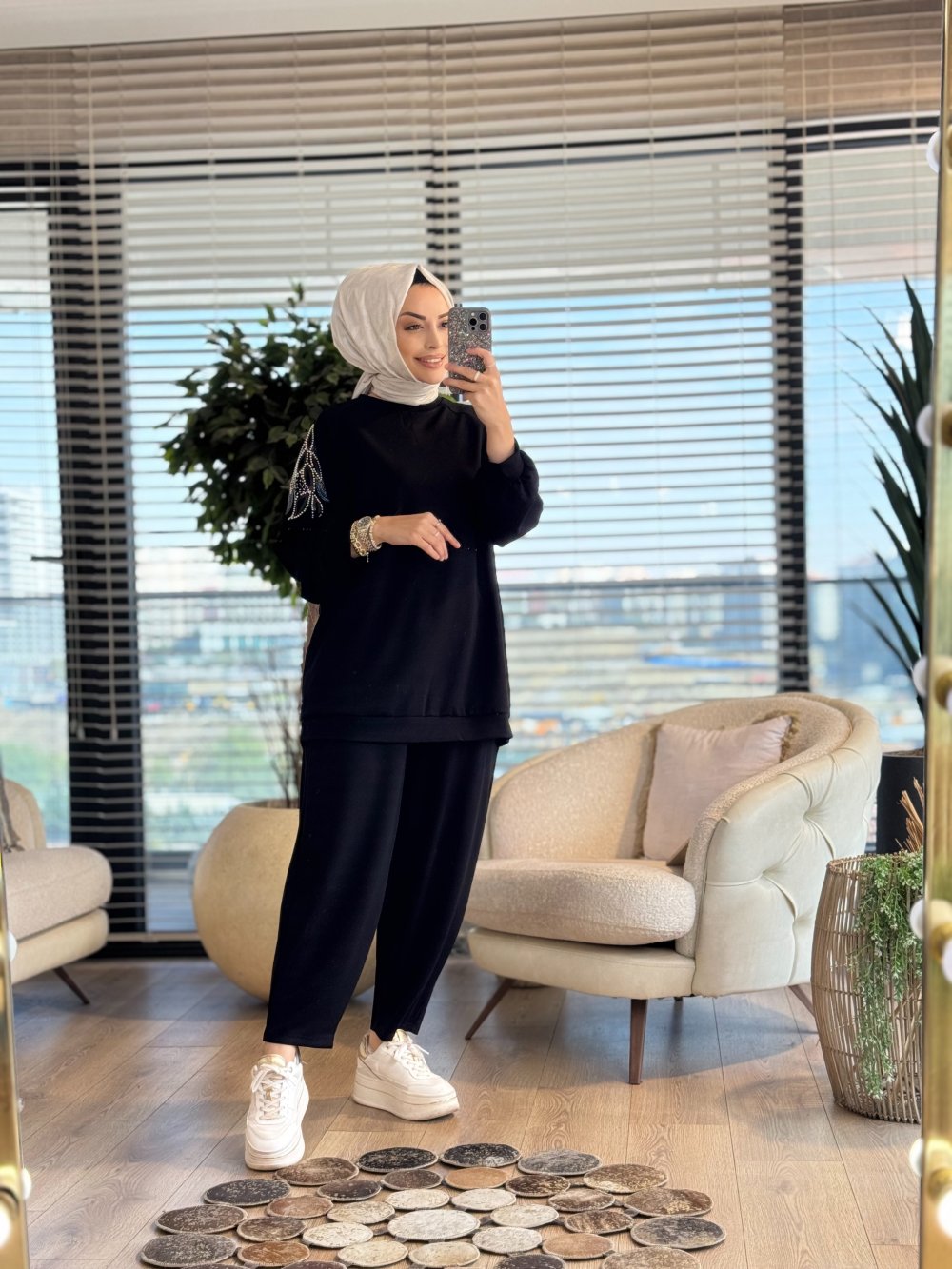 24361 Sol Omzu Boncuk İşli Tunik Siyah