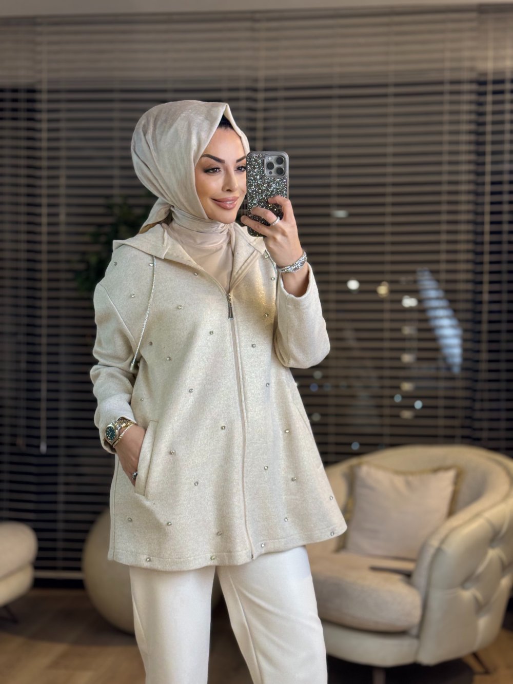 2444 Triko Üst Serpme Taşlı Kapş.Fermuarlı Ceket Bej