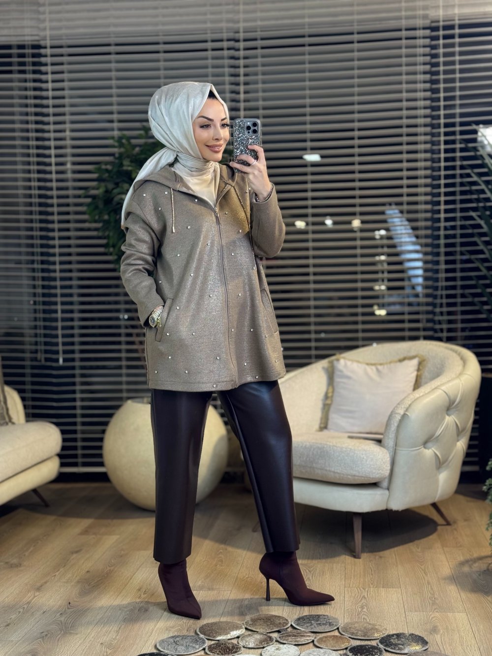 2444 Triko Üst Serpme Taşlı Kapş.Fermuarlı Ceket Vizon